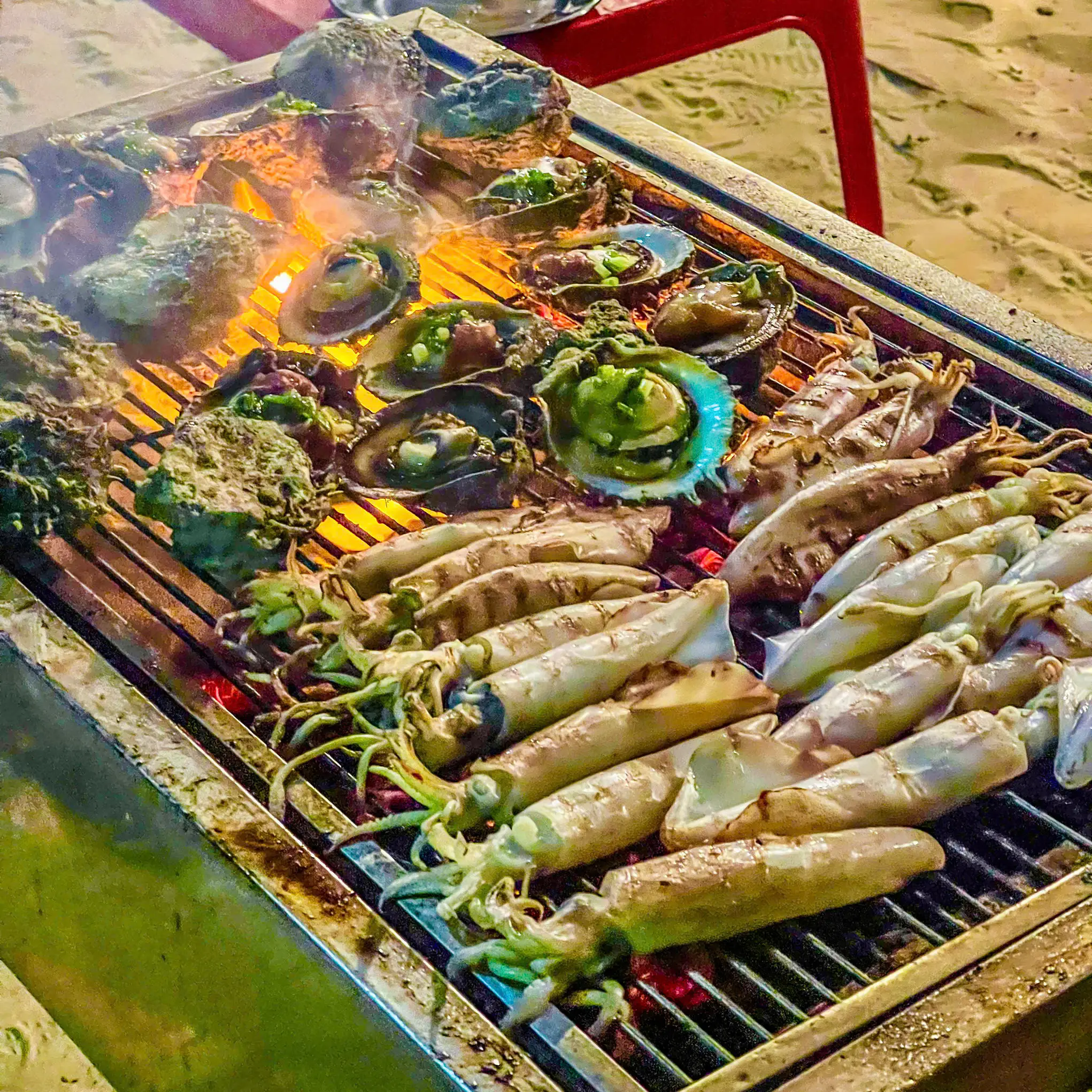 Savor freshly caught squid, clams, and shellfish grilled right on the beach – authentic island flavors at friendly prices.